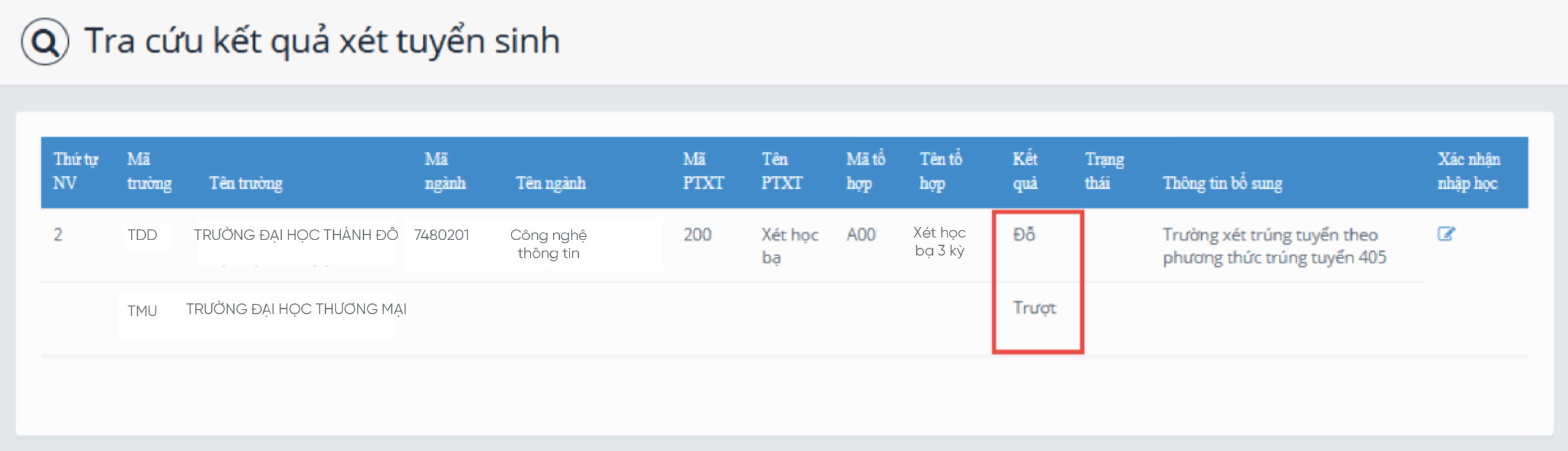 Nếu kết quả là Trượt có nghĩa là thí sinh trượt tất cả các nguyện vọng đã đăng ký vào trường.