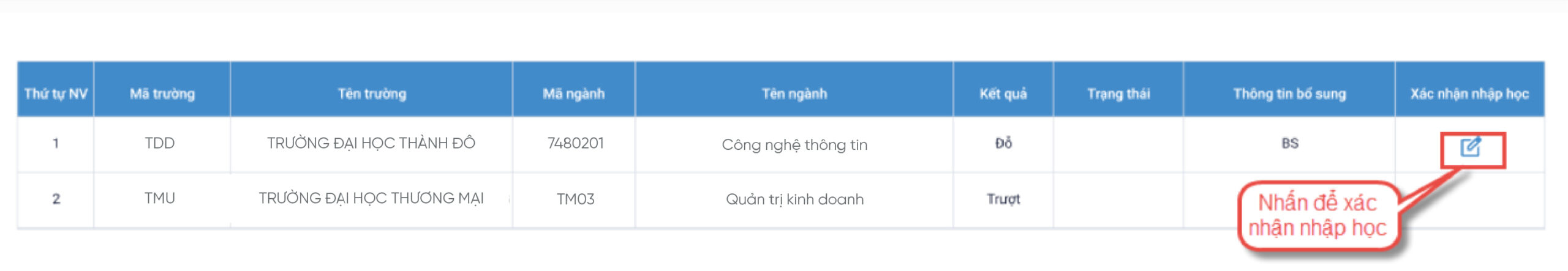Đối với nguyện vọng đỗ thí sinh có quyền xác nhận nhập học. Để xác nhận nhập học thí sinh nhấn nút Xác nhận nhập học như hình dưới.