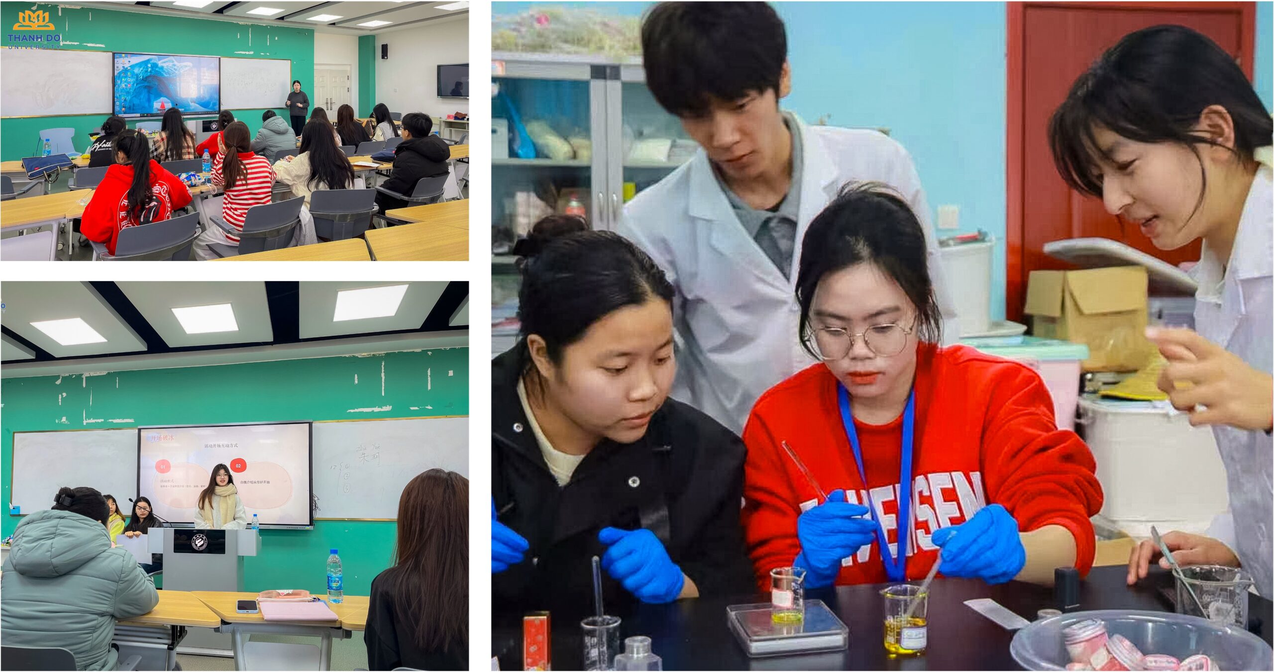 Thadoer trong những giờ học khẩu ngữ, thực hành thí nghiệm cùng sinh viên Học viện Văn Sơn (Trung Quốc)