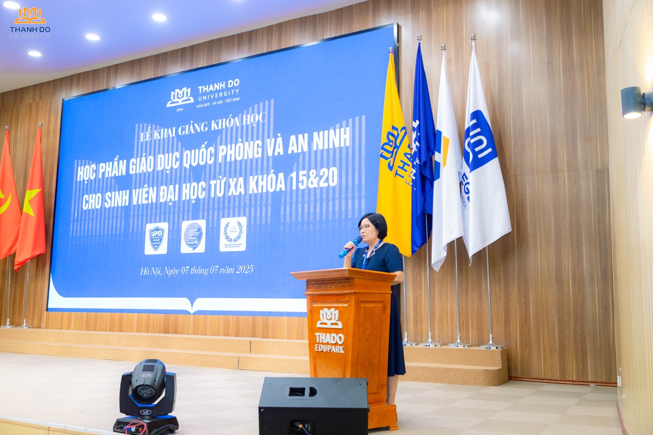 Phát biểu khai mạc buổi lễ, TS. Nguyễn Thuý Vân, Phó Hiệu trưởng nhấn mạnh rằng Giáo dục Quốc phòng và An ninh là học phần bắt buộc trong chương trình đào tạo đại học, mang tính giáo dục toàn diện, rèn luyện ý thức công dân, xây dựng lòng yêu nước, trách nhiệm bảo vệ Tổ quốc và hiểu biết về nhiệm vụ quốc phòng – an ninh trong tình hình mới.