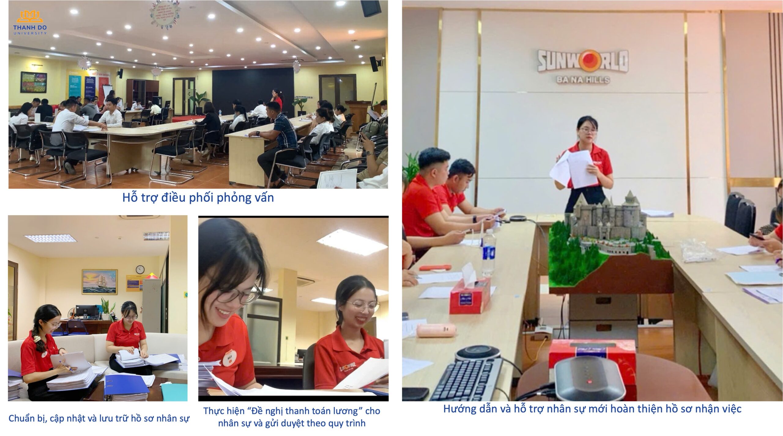 Sinh viên Nguyễn Thị Mỹ Tâm, đại diện cho các bạn sinh viên tại bộ phận hành chính nhân sự, chia sẻ chi tiết về vị trí công việc được đảm nhận đã cho bạn nhiều trải nghiệm thực tế giá trị. “Những điều em nhận lại được sau kỳ thực tập đó là sự thành thạo trong tin học văn phòng, phần mềm chấm công, quản lý nhân sự; là những trải nghiệm không có trong sách vở, là cơ hội được giao lưu, kết nối, tiếp xúc thường xuyên với du khách nước ngoài”. Công việc mà Mỹ Tâm đảm nhiệm tại bộ phận hành chính nhân sự, bao gồm hướng dẫn và hỗ trợ nhân sự mới hoàn thiện hồ sơ nhận việc, hỗ trợ điều phối phỏng vấn, chuẩn bị, cập nhật và lưu trữ hồ sơ nhân sự, thực hiện đề nghị thanh toán lương, v.v.